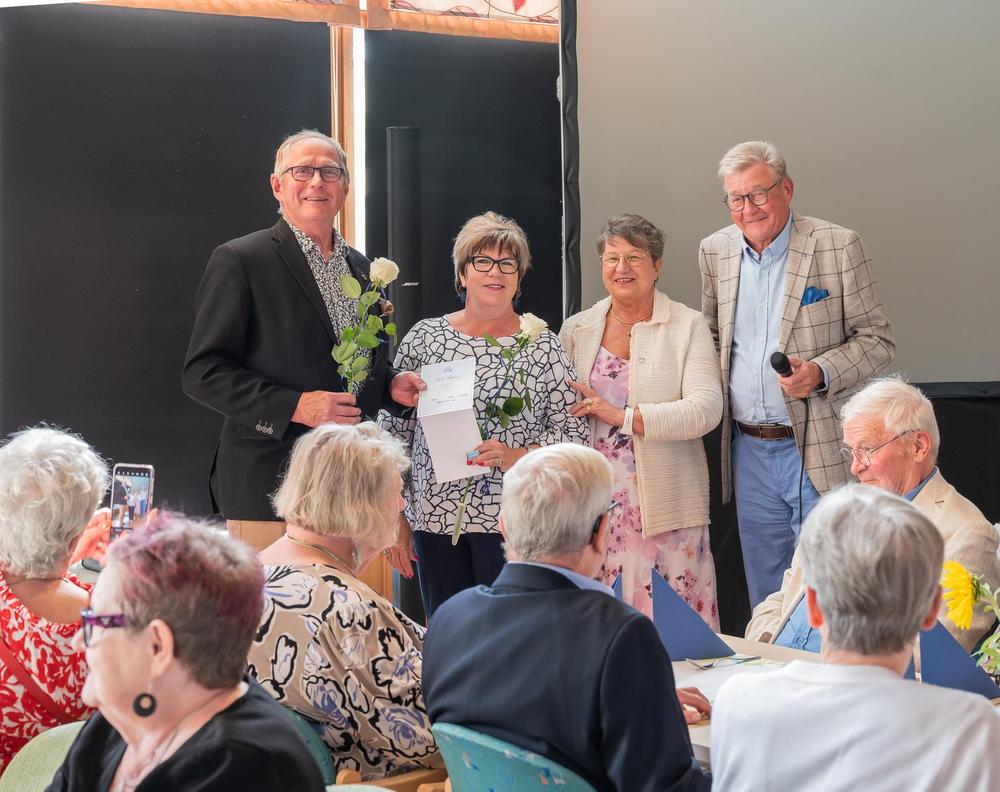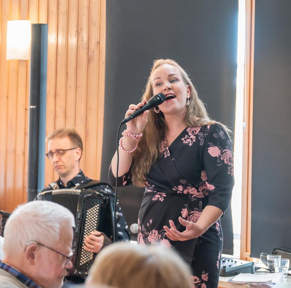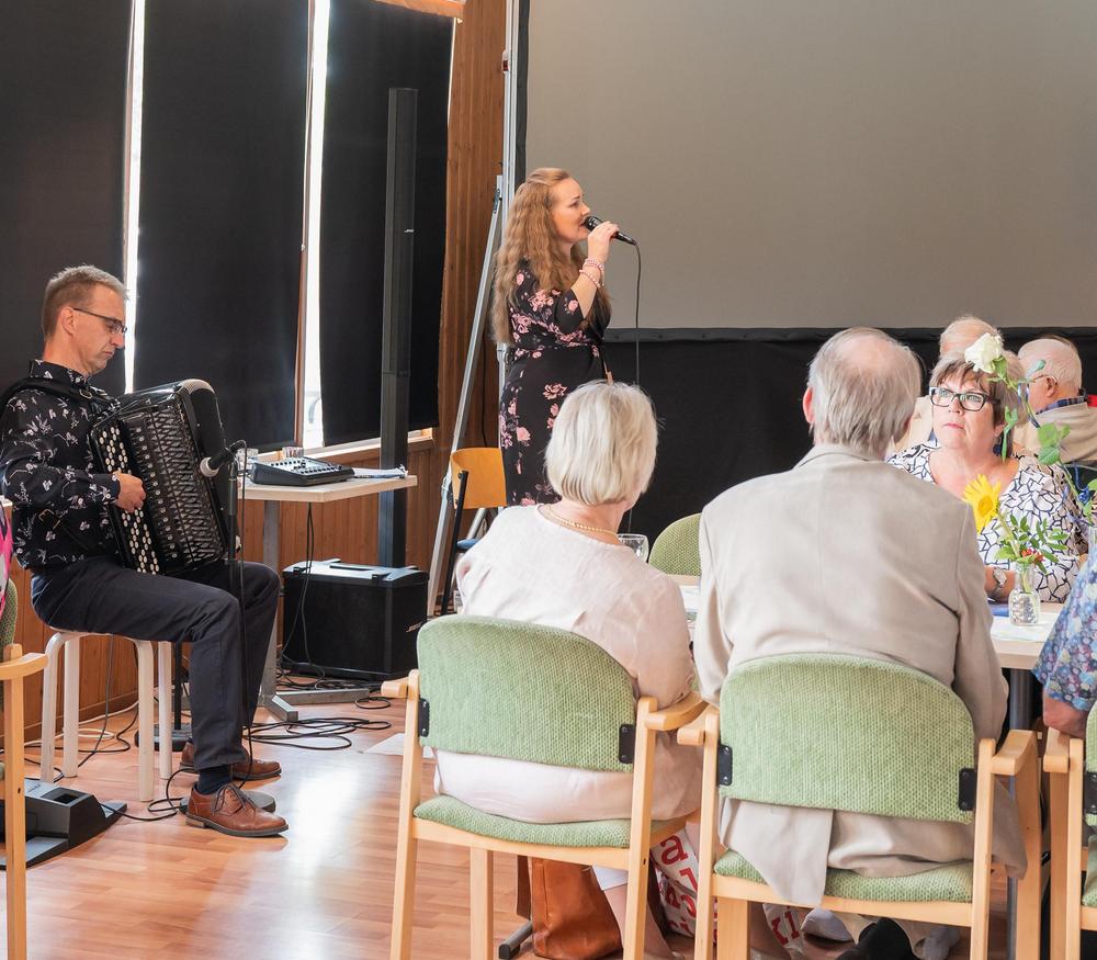 Perinteisesti nautimme maittavan lounaan jälkiruokineen. Ohjelmassa oli myös ansiomerkkien jako. Musiikkipuolesta vastasivat Titta Liukkala lauluillaan ja Reijo Ahonen harmonikalla.