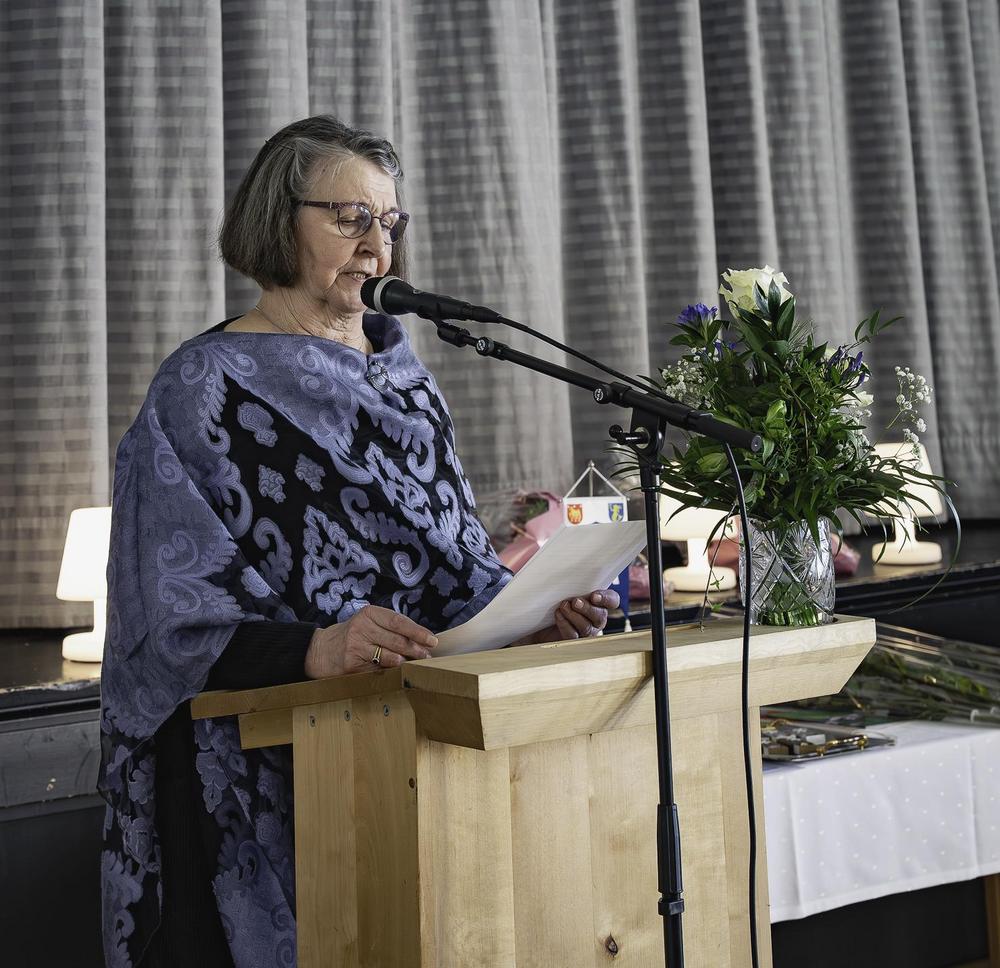 Ulla Kartano esittelemässä yhdisyksen 30-vuotis historiikkiä. Historiikin kirjoittajien kukitus.
