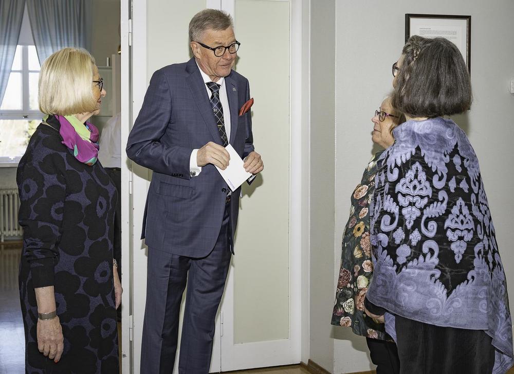 Ansiomerkkien jako. Kultainen ansiomerkki myönnettiin Kaisu Koskuelle, Marja Nummiselle, Kalle Sistolalle ja Riitta Tarvaiselle. (Riitta Tarvainen puuttuu kuvasta.)