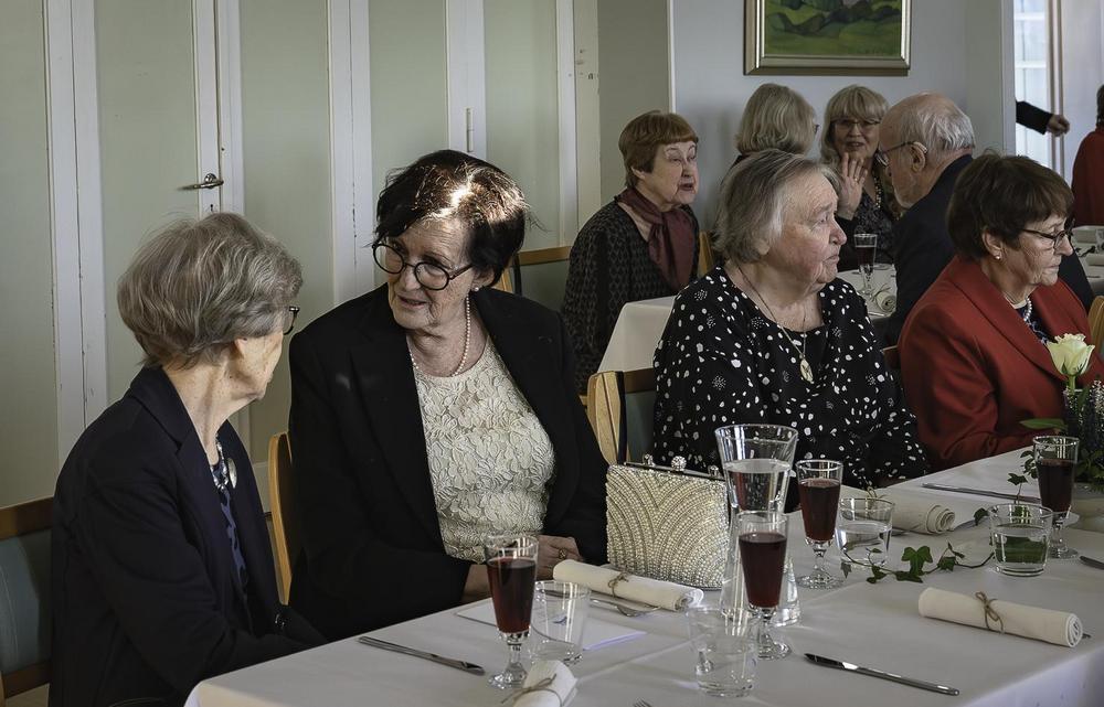 Yhdistyksen puheenjohtaja Merja Vilén ja sihteeri Marja-Riitta Heinonen vastaanottamassa kutsuvieraita.