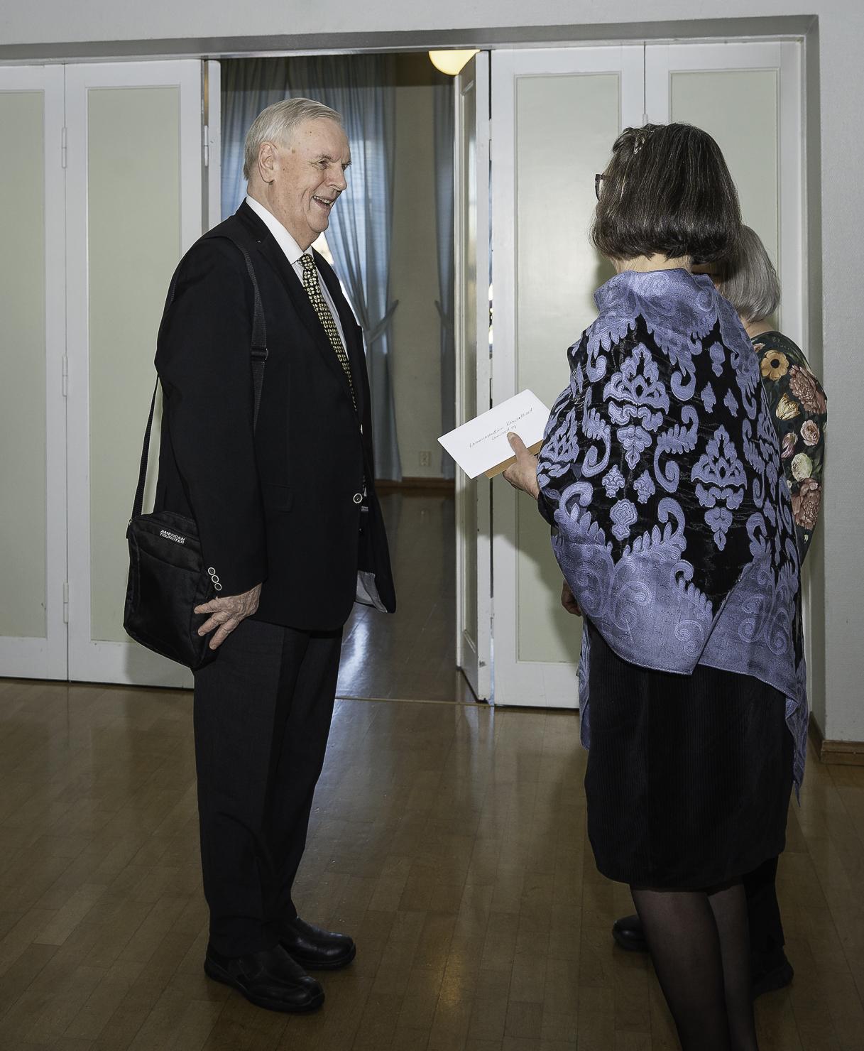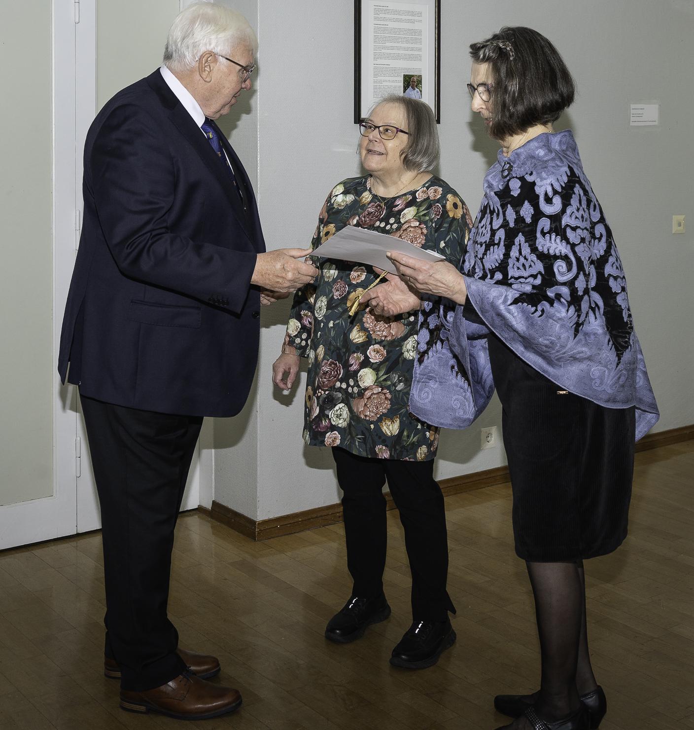 Yhdistyksen puheenjohtaja Merja Vilén ja sihteeri Marja-Riitta Heinonen vastaanottamassa kutsuvieraita.
