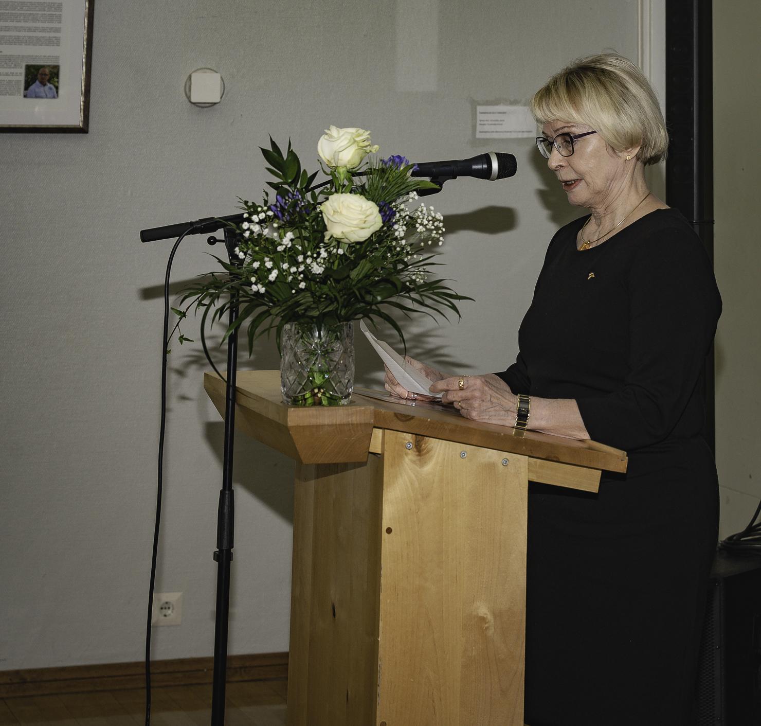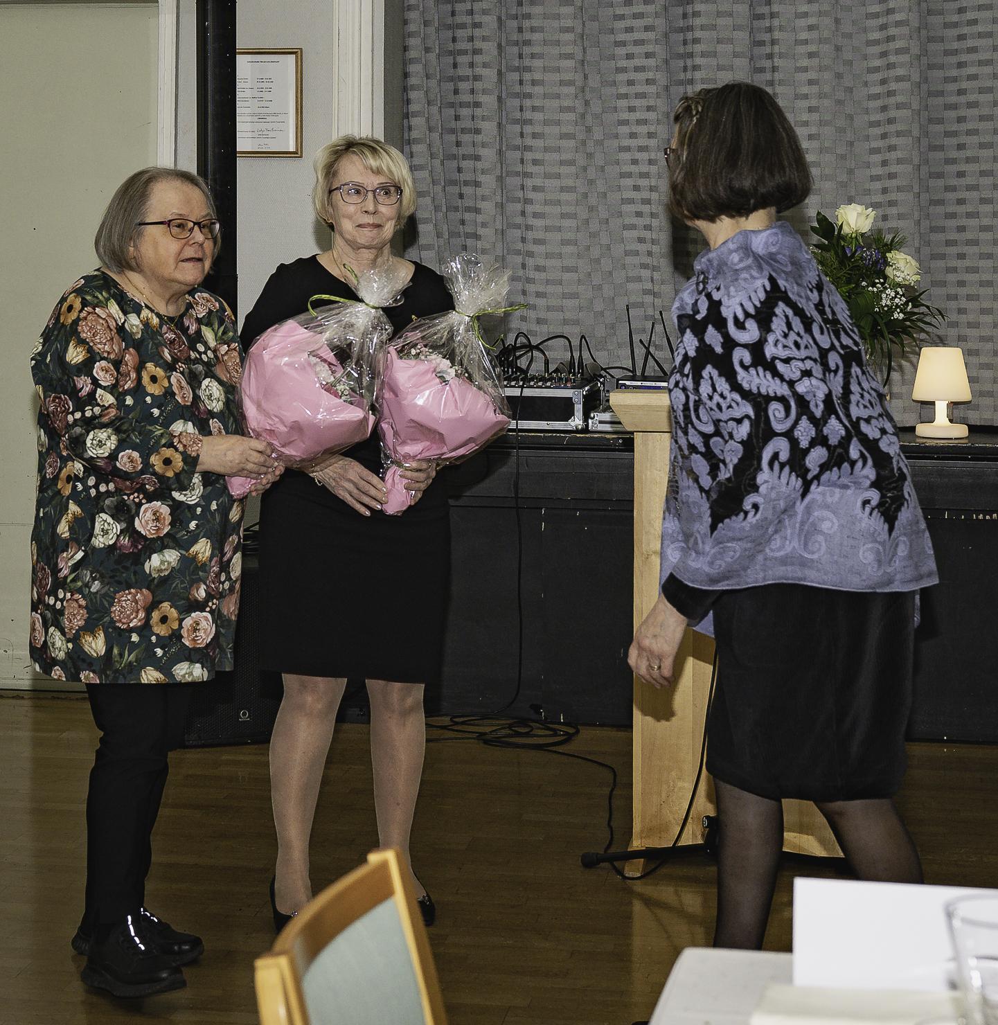 Ulla Kartano esittelemässä yhdisyksen 30-vuotis historiikkiä. Historiikin kirjoittajien kukitus.