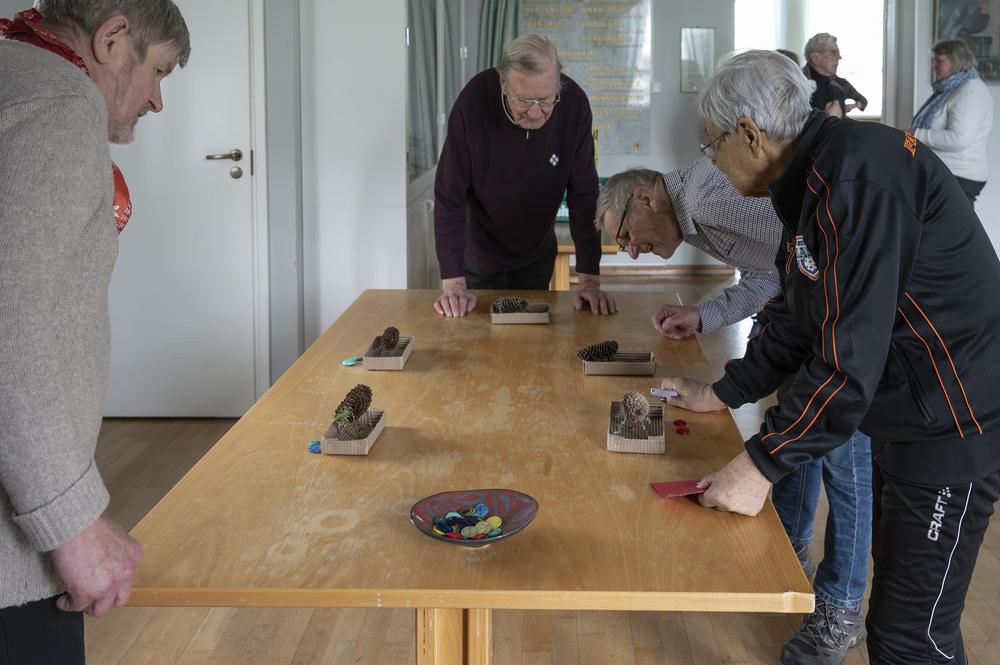 Suunnistuksen jälkeen suuntasimme lounaalle Turvantalolle. Ennen lounasta äänestimme parhaan teoksen. Käpylehmät oli aseteltu karsinoihin pöydälle. Jokainen sai käydä äänestämässä omaa suosikkiaan parhaaksi lehmäksi. Äänestys tapahtui melkein nappia painamalla: yksi ääni, yksi nappi. Ja tietty, käpylehmäkisaan osallistuneille jaettiin kunniakirjat taidokkaasta käpymuotoilusta, huolellisesta tikkujalkasuunnittelusta ja aidon maalaishengen vaalimisesta.